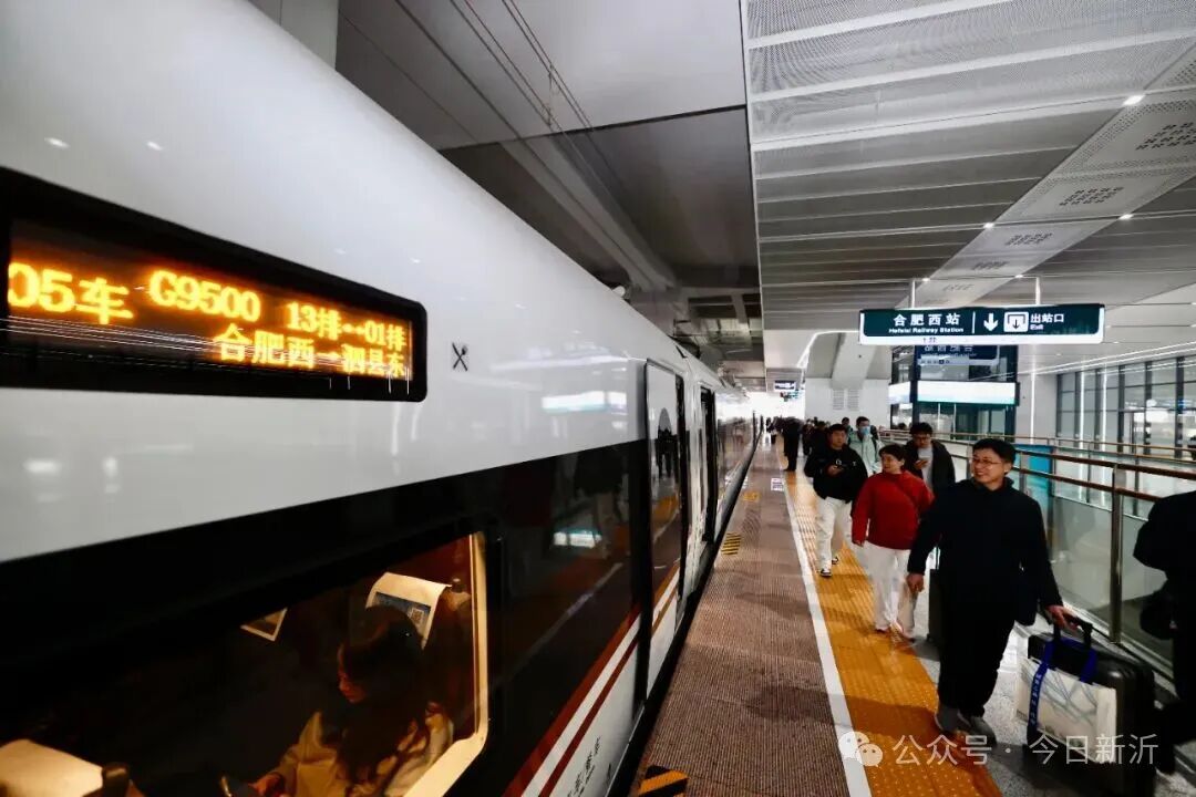 12月30日9时18分许,首趟始发列车G9500次从合肥西站开出,沿着新建合肥至新沂高速铁路合肥至泗县段(以下简称合新高铁合泗段)驶向泗县方向,标志着合新高铁合泗段正式开通运营。合肥西站,乘客正在登车