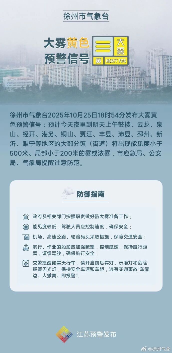 昨天受高空槽东移影响全省云系增多白天西北部地区有时有小雨缺少了灿烂的阳光气温总体有些许下滑今起(26-28日)江苏以多云天气为主今晨西北部地区局部有雾或浓雾对此徐州市气象台发布大雾黄色预警信号▼预计到