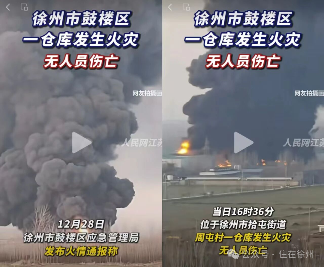 12月28日,徐州市鼓楼区应急管理局发布火情通报称,当日16时36分,位于徐州市拾屯街道周屯村一仓库发生火灾,无人员伤亡。(来源:鼓楼发布公众号)(图源:人民网江苏视频号)