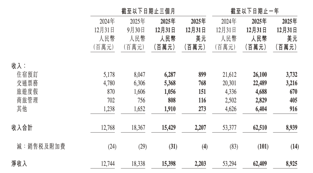 2月26日,在线旅游平台携程集团(携程,Nasdaq:TCOM;携程集团-S,09961.HK)发布2025年第四季度及全年未经审计的财务业绩。财务数据显示,2025年第四季度,携程净营收约153.9