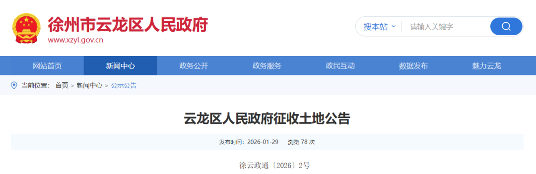 近日云龙区人民政府发布征收土地公告具体内容一起来看看▼▼▼徐云政通〔2026〕2号经省政府批准,同意将我区骆驼山街道、大郭庄街道的农民集体所有农用地12.4282公顷(其中耕地8.7749公顷)、未利