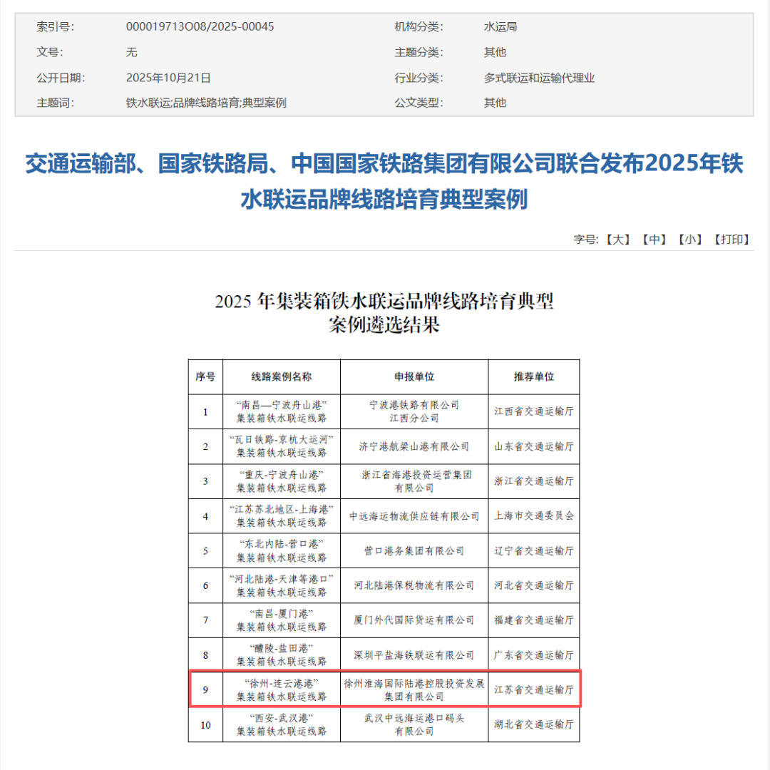 喜报“徐州—连云港港”集装箱铁水联运线路成功入选国家典型案例近日,交通运输部、国家铁路局、中国国家铁路集团有限公司联合发布2025年铁水联运品牌线路培育典型案例名单,徐州陆港集团申报的“徐州—连云港港