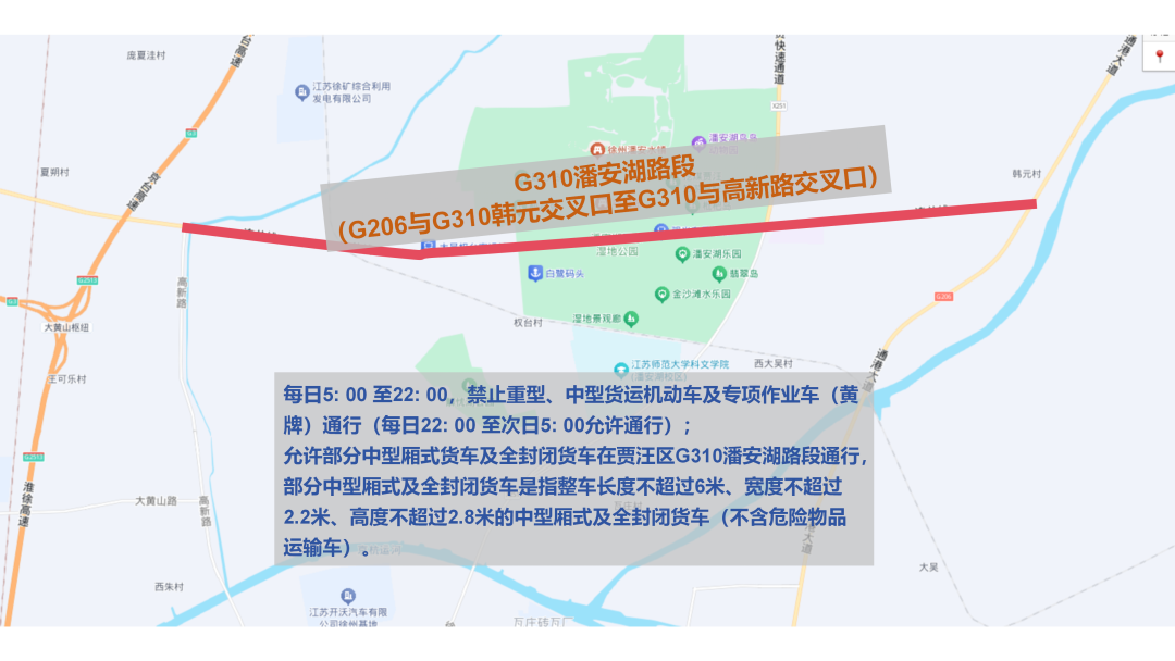 关于对贾汪区G310潘安湖路段实行交通限制的通告为维护市区道路交通秩序,预防和减少交通事故,提高通行效率,依据《中华人民共和国道路交通安全法》和《中华人民共和国公路法》等有关规定,徐州市贾汪区交通运输