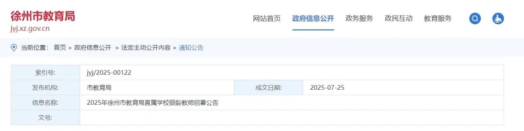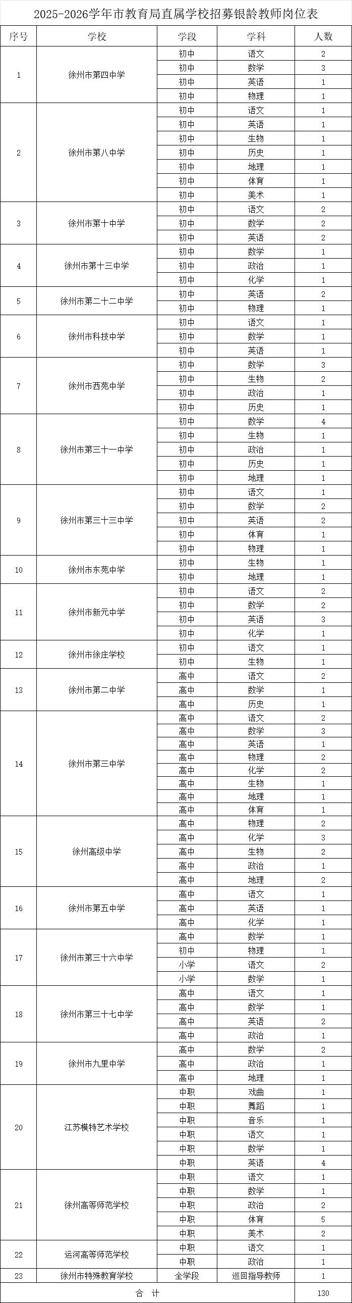 徐州市教育局最新发布公告招募银龄教师130人↓↓↓2025年徐州市教育局直属学校银龄教师招募公告依据国家、省、市关于新时代教师队伍建设改革意见精神,为充分发挥优秀退休教师示范引领作用,根据工作需要,2