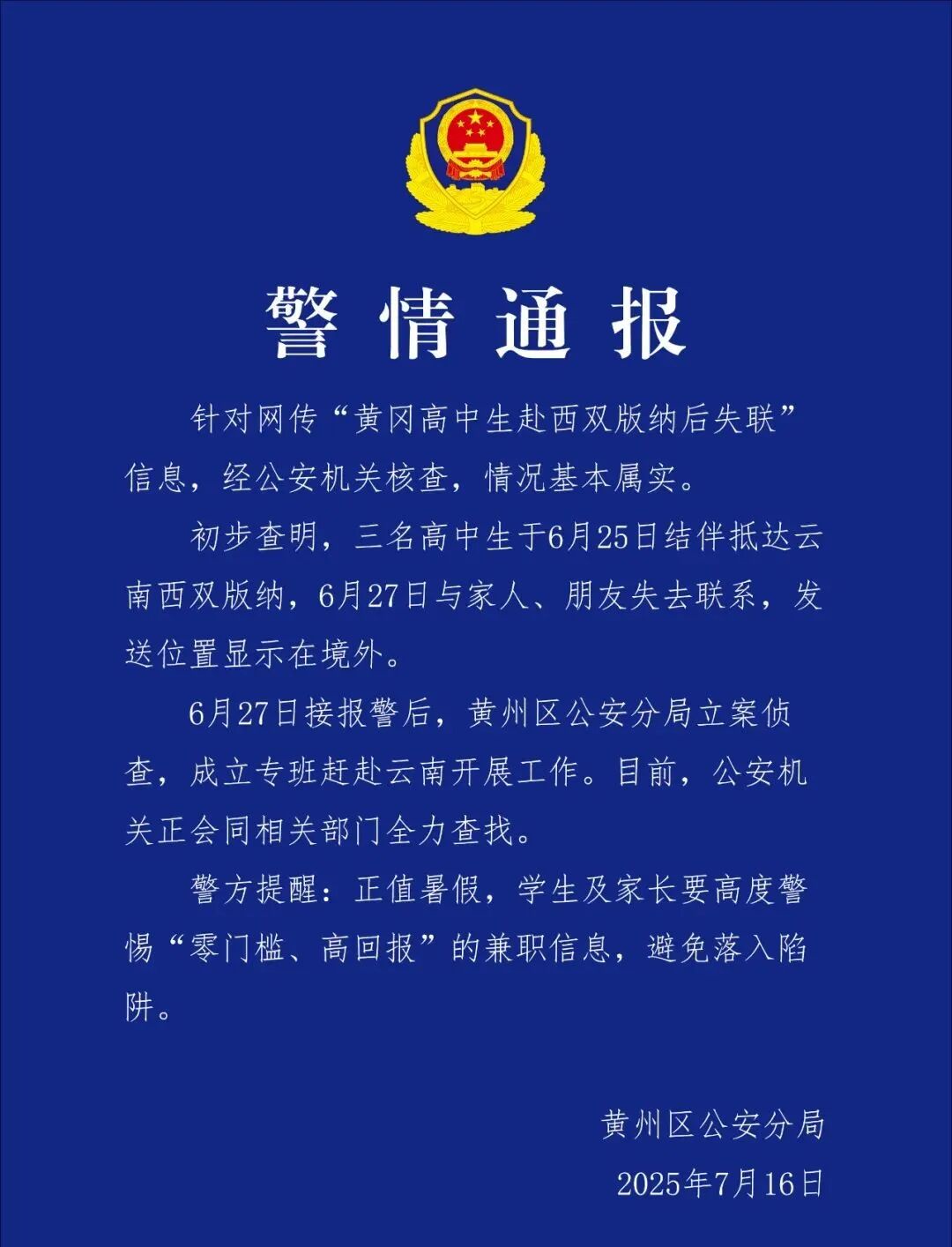 7月16日,湖北黄冈黄洲区公安分局发布警情通报:针对网传“黄冈高中生赴西双版纳后失联”信息,经公安机关核查,情况基本属实。初步查明,三名高中生于6月25日结伴抵达云南西双版纳,6月27日与家人、朋友失