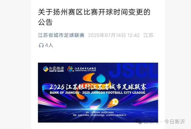 刚刚江苏省城市足球联赛发布了一条关于扬州赛区比赛开球时间变更的公告球迷朋友们快来看看吧!公 告为提升球迷观赛体验,经扬州赛区申请及相关队伍同意,组委会研究决定,同意第七轮7月20日扬州队