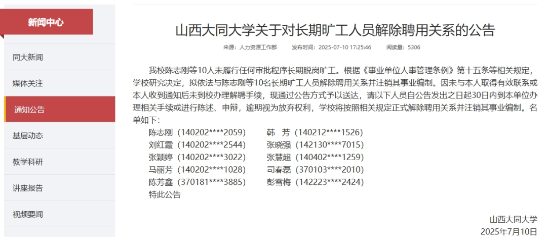 7月10日,山西大同大学发布公告,拟解聘10名长期脱岗旷工人员并注销其事业编制。7月12日,记者获悉,相关人员均为教师,截至目前暂无人与学校联系。▲公告截图。图源:山西大同大学网站公告显示,该校陈志刚