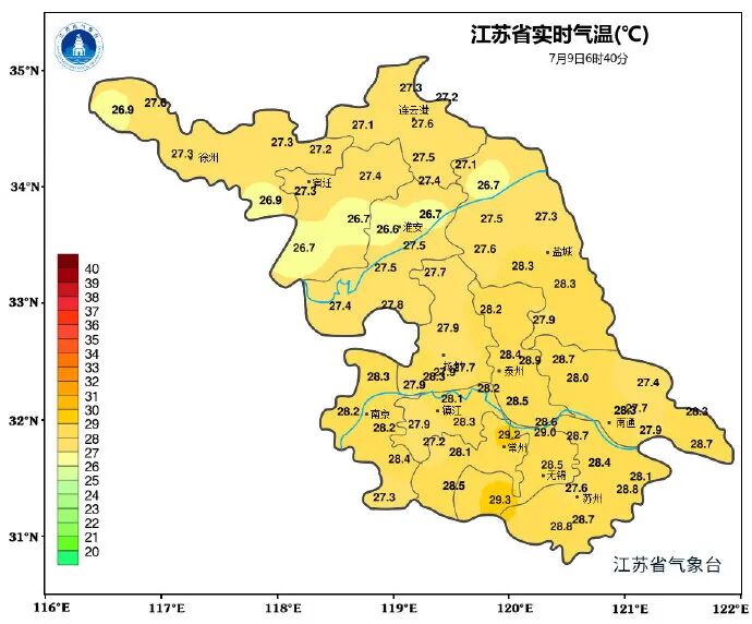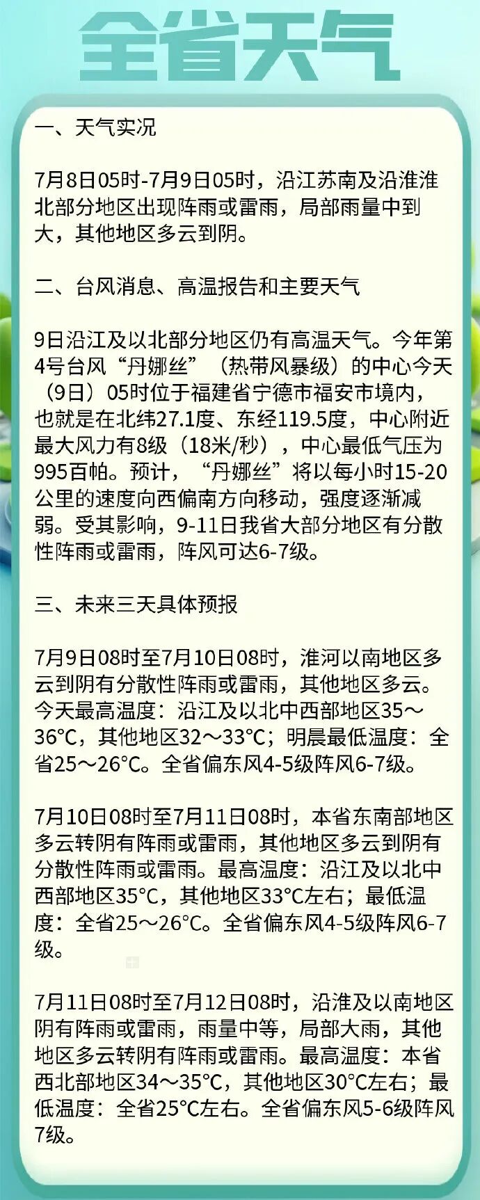 今晨(7月9日)江苏大部分地区的气温在26℃—28℃体感闷热出行要注意多补水江苏气象最新发布7月9日,沿江及以北部分地区仍有高温天气。今年第4号台风“丹娜丝”(热带风暴级)的中心今天(7月9日)5时位