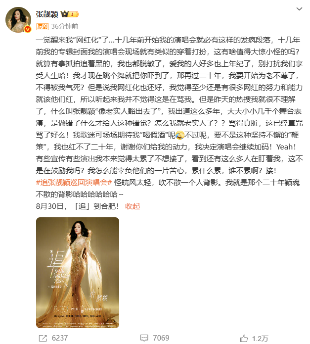 近日,网友称张靓颖网红化引热议。7月8日,张靓颖发文回应,称自己十几年前的演唱会就必有“这样的发疯段落”,专辑封面、演唱会也有类似的穿着打扮,已对抓拍追黑行为脱敏。张靓颖示说她“网红化”不觉得在骂自己