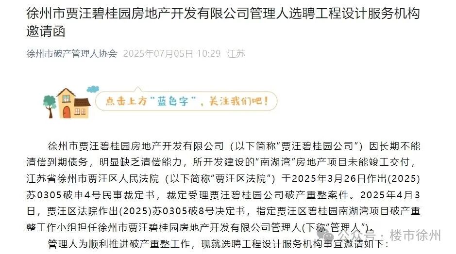 2025年,房地产市场破产、重组、重整仍在继续。近日,徐州市破产管理人协会发布《徐州市贾汪碧桂园房地产开发有限公司管理人选聘工程设计服务机构邀请函》。2025年4月3日,贾汪区法院作出(2025)苏0