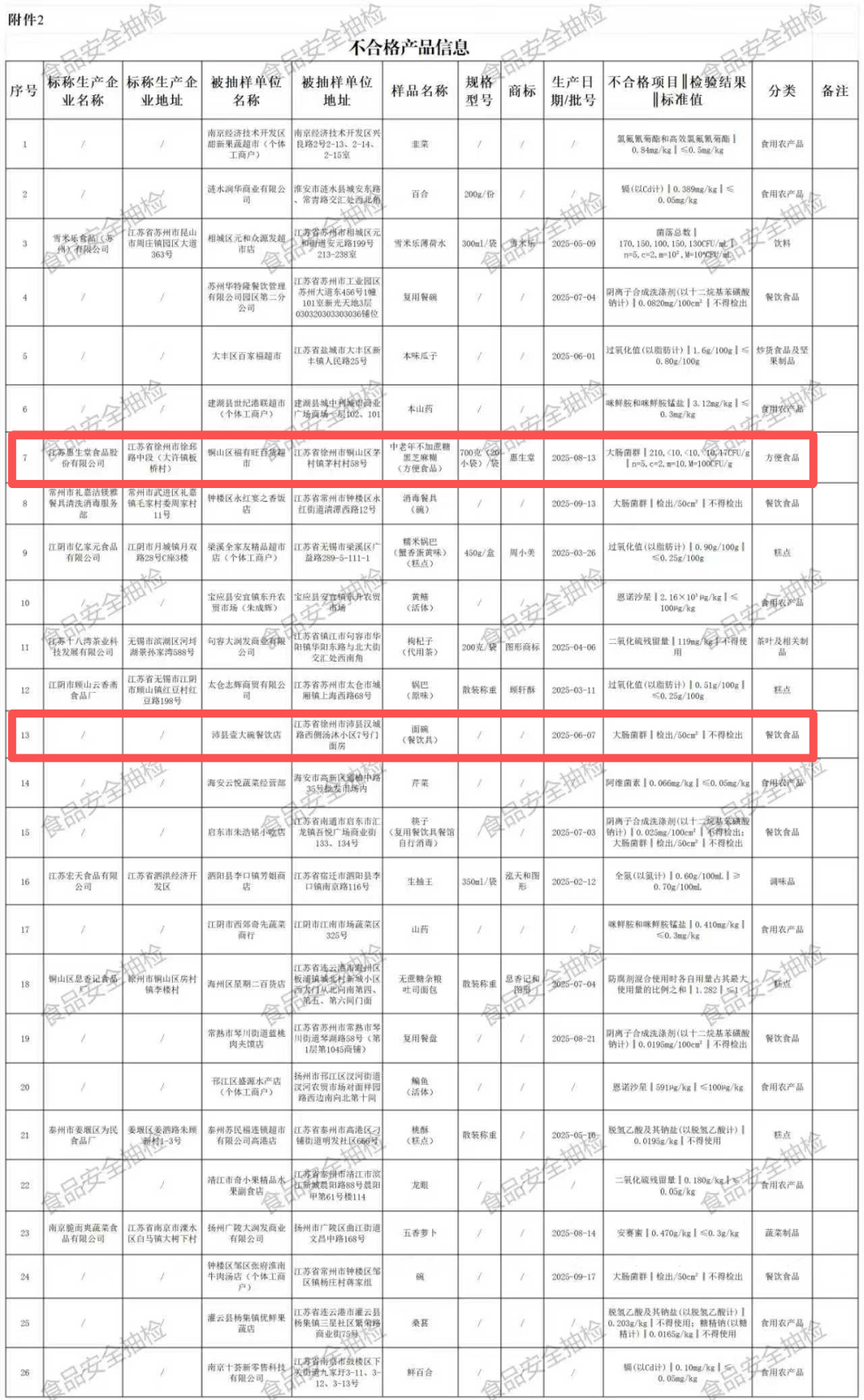 近日江苏省市场监督管理局发布关于26批次食品抽检不合格情况的通告涉及徐州2例▼▼▼近期,江苏省市场监督管理局组织食品安全抽检,抽取食用农产品、调味品、糕点、粮食加工品、餐饮食品、饮料、肉制品、方便食品