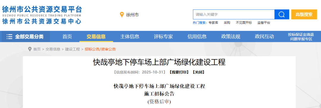 近日徐州市公共资源交易平台发布快哉亭地下停车场上部广场绿化建设工程施工招标公告建设地点:徐州市云龙区解放路东侧,建国东路北侧。建设内容及规模:对快哉亭地下停车场上部广场进行绿化建设,用地总面积1279