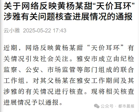 近期,05后女演员黄杨钿甜天价耳环事件引发关注,刚刚(5月22日),四川省雅安市联合工作组发布通报:近期,网络反映黄杨某甜“天价耳环”有关情况引发社会关注。雅安市成立由纪检监察、公安、市场监管等部门组