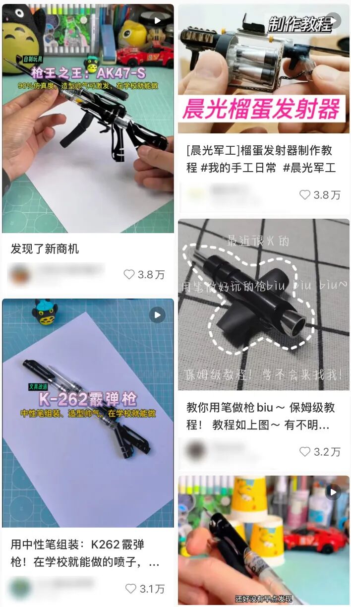 “用中性笔组装狙击步枪,90%超高仿真度,可发射,在学校就能做。”近一段时间,社交媒体平台上出现了一些教大家制作“笔枪”的视频,3支普通的中性笔被拆解,重新组装后,一把迷你“笔枪”便完成了。然而,看似