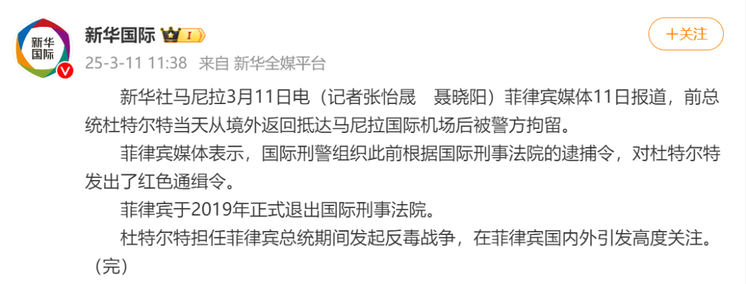 菲律宾媒体11日报道,菲律宾前总统杜特尔特当天从境外返回抵达马尼拉国际机场后被警方拘留。▲资料图(央视新闻)菲律宾媒体表示,国际刑警组织此前根据国际刑事法院的逮捕令,对杜特尔特发出了红色通缉令。菲律宾