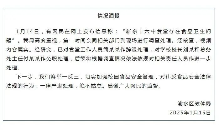 近日,有视频显示,江西新余一学校食堂员工脚踩食材,网友质疑该校食品卫生问题。15日,江西省新余市渝水区教体局发布情况通报。网络视频画面情况通报1月14日,有网民在网上发布信息称:“新余十六中食堂存在食