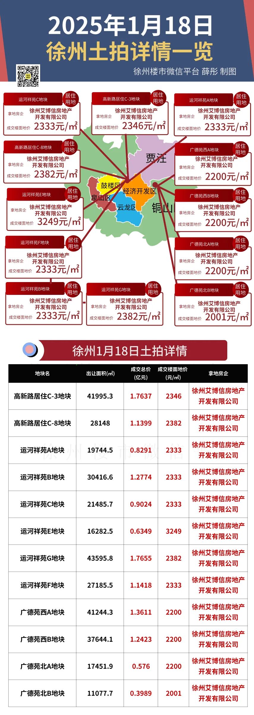 2025年,徐州第一场土拍来了!徐州经开区卖出12块宅地,主要位于高新路大黄山板块、陇海新城板块,占地面积约33万㎡,成交总价13亿元,均被徐州艾博信房地产开发底价摘得。一、大黄山卖出8块宅地,成交楼