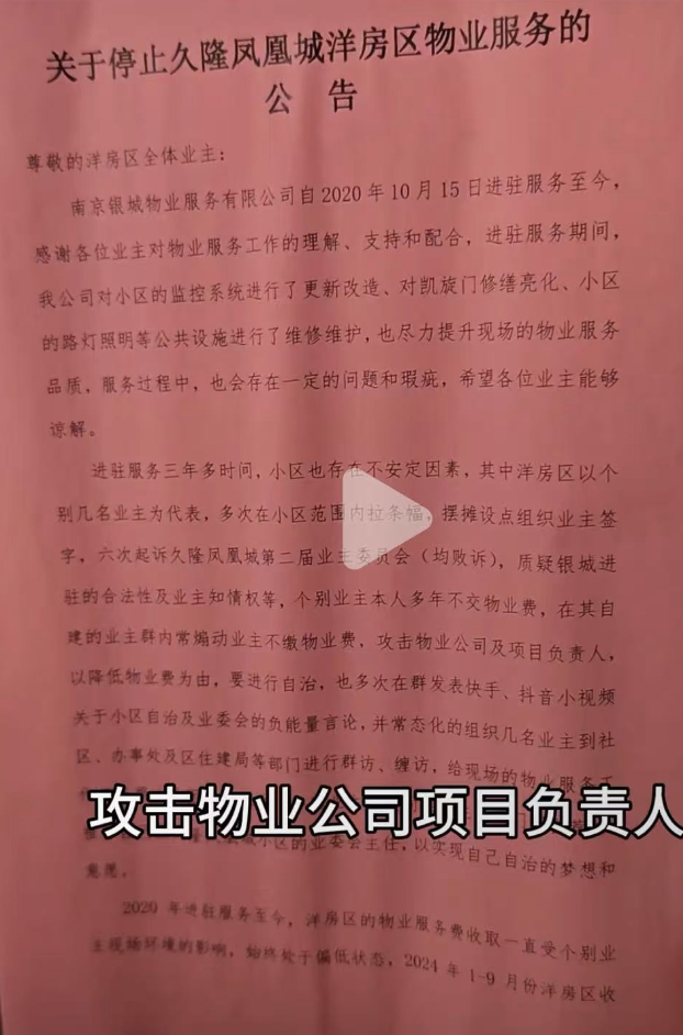 最近,徐州又有2家楼盘物业公司宣布,严重亏损,停止服务,退出小区!1、铜山区久隆凤凰城的银城物业发公告:2024年1-9月,洋房区收缴率仅为45%,处于严重亏损状态,所以决定于2025年1月1日停止对