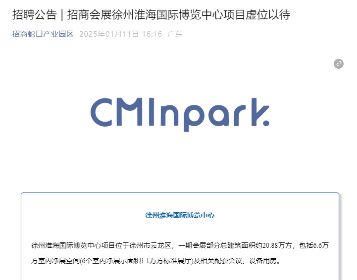 徐州2025年好消息不断!新城区重磅地标——淮海国际博览中心未完成的部分将会续建完工。就在这两天,招商蛇口突然发布关于徐州淮海国际博览中心的招聘公告,预示着徐州新城区的淮海国际博览中心项目后续建设将由