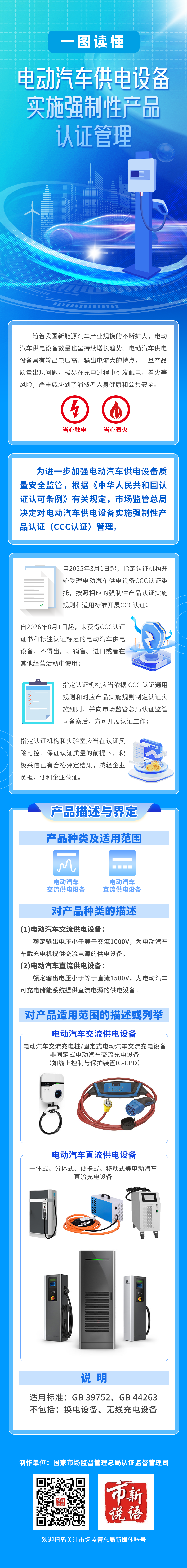 近日市场监管总局发布公告决定将具有较高安全风险的电动汽车供电设备纳入强制性产品认证目录范围实施市场准入管理切实筑牢产品质量安全底线此次纳入的主要包括生活中常见的固定充电桩移动式充电设施随车充电设备等市