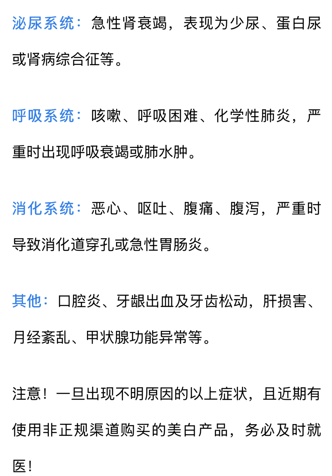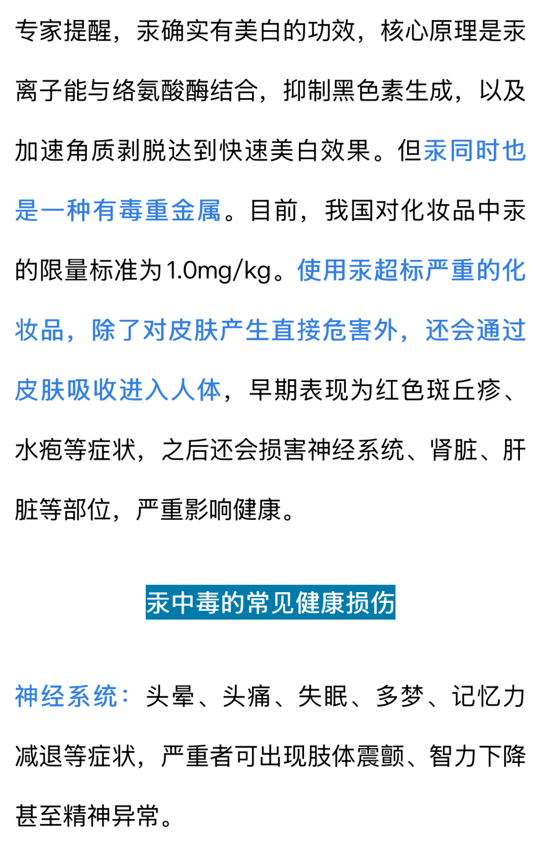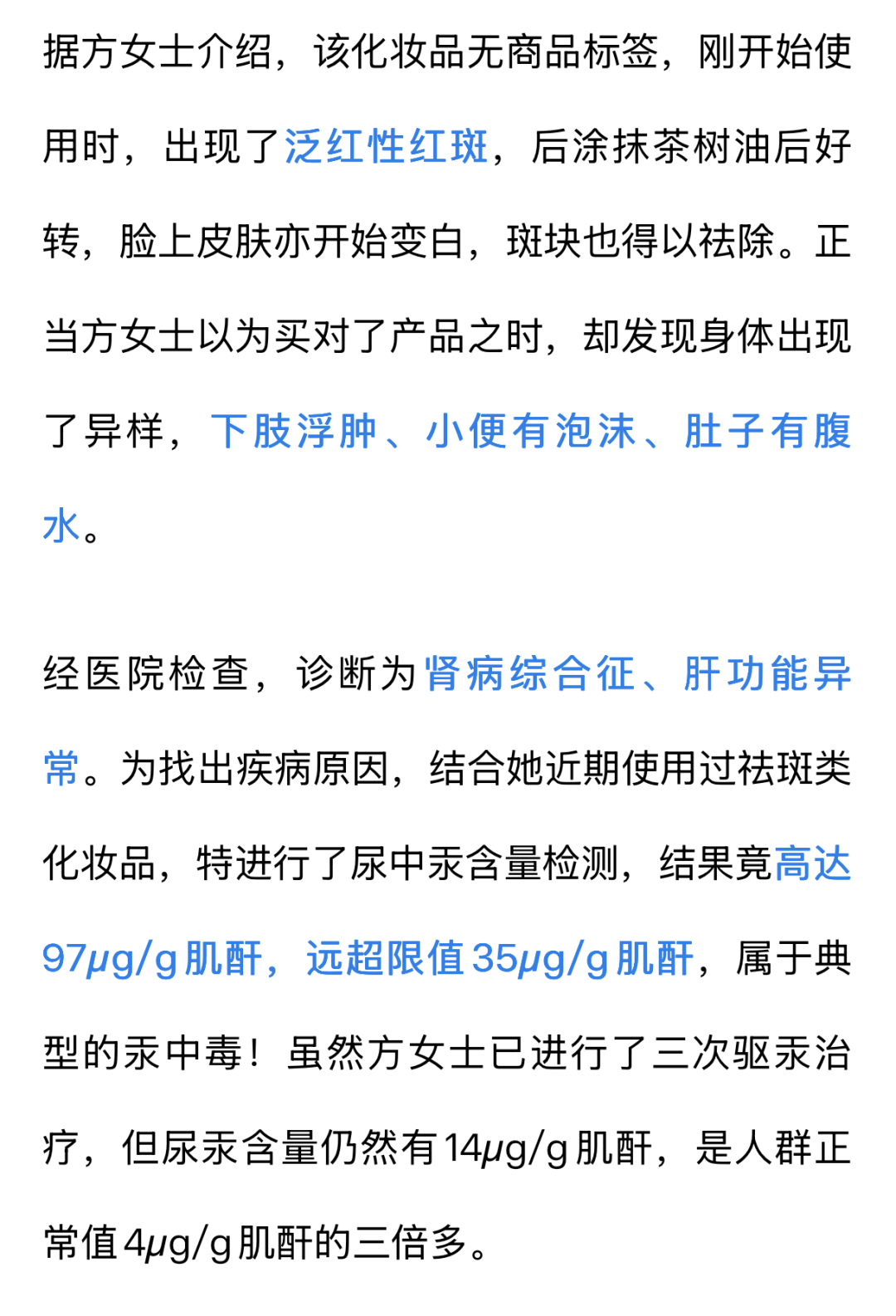 宁波的方女士看见邻居使用了一款美白祛斑化妆品效果很好,于是也购买了一套。在使用了3个月之后,原本身体健康的她却被诊断为汞中毒。经宁波市疾控中心理化科检测,该化妆品中汞含量超标近5000倍!使用美白产品