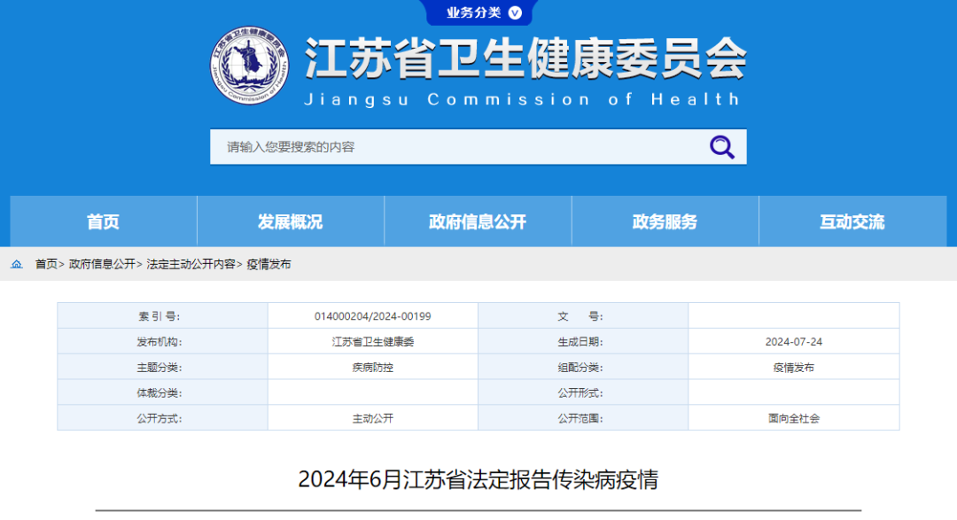 日前江苏省卫生健康委公布2024年6月全省法定报告传染病疫情2024年6月1日0时至6月30日24时,除新型冠状病毒感染外,全省共报告甲、乙类法定传染病发病14868例,死亡46人;本月除鼠疫、霍乱、