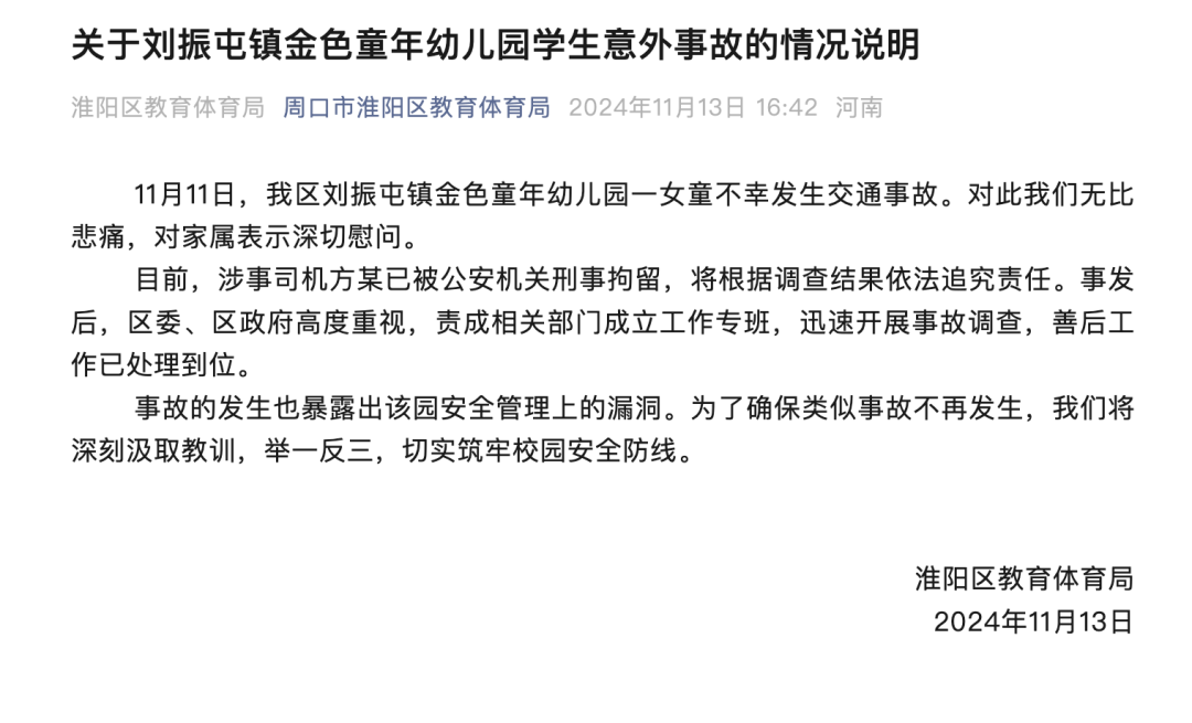 11月12日有多名网友在社交平台发布视频称在河南周口市淮阳区刘振屯镇发生一起幼儿园校车碾压儿童事故刚刚周口市淮阳区教育体育局发布通报涉事司机已被公安机关刑拘通报如下:11月11日,该区刘振屯镇金色童年