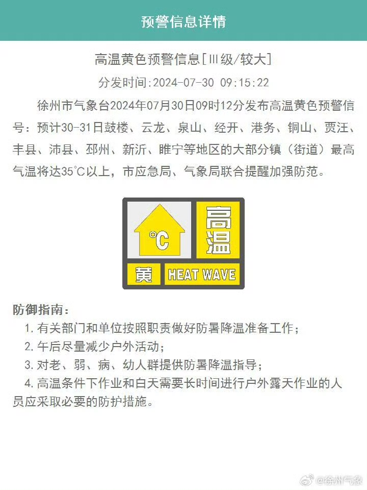 徐州市气象台今天9时12分发布高温黄色预警信号预计30-31日鼓楼、云龙、泉山、经开、港务、铜山、贾汪、丰县、沛县、邳州、新沂、睢宁等地区的大部分镇(街道)最高气温将达35℃以上,市应急局、气象局联合