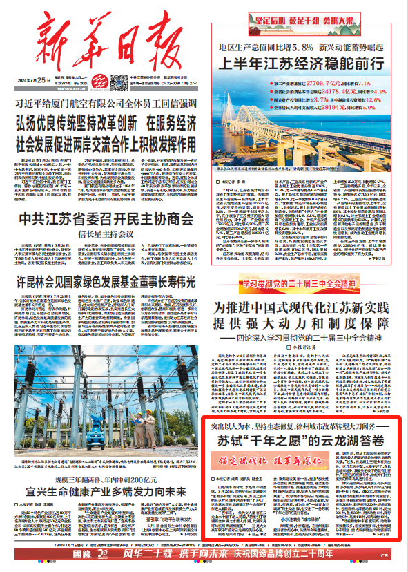 就在今天新华日报头版“锚定现代化,改革再深化”专栏聚焦徐州大文豪苏轼对云龙湖曾许下美好心愿:“若能引丁塘湖和金钟湖之水灌入此湖此湖风光可与杭州西湖相媲美”如今徐州如何努力为苏轼的“千年之愿”交出一份满