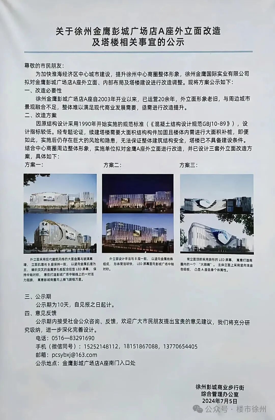 城市地标建筑的建设,一直备受市民关注。前些年,徐州市中心金鹰双子塔效果图一曝光,引起众多市民对这座新摩天大楼的期待。不过,最新公示发布,金鹰双子塔不建了。7月5日,徐州彭城商业步行街综合管理办公室发布