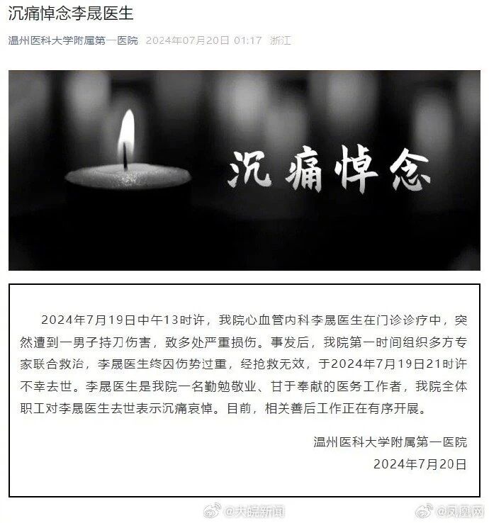 7月20日凌晨,温州医科大学附属第一医院官方微信公众号发布悼文《沉痛悼念李晟医生》:2024年7月19日中午13时许,我院心血管内科李晟医生在门诊诊疗中,突然遭到一男子持刀伤害,致多处严重损伤。事发后