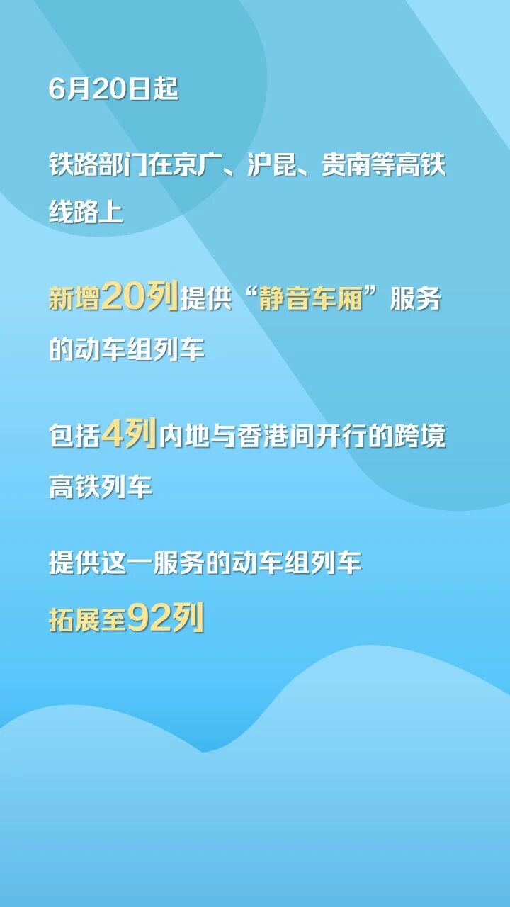 自6月20日起,铁路部门提供“静音车厢”服务的动车组列车新增20列,拓展至92列动车组列车,更好地满足广大旅客对美好旅行生活的需求。为营造文明有序、温馨舒适的旅行环境,铁路部门自2020年12月起在京