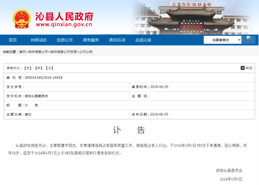 5日,山西沁县人民政府网站发布讣告:沁县政协党组书记、主席郭建宇同志,负责清理违规占有国有房屋工作,被违规占有人行凶,于2024年6月3日7时许不幸遇难,因公殉职,终年58岁。兹定于2024年6月7日