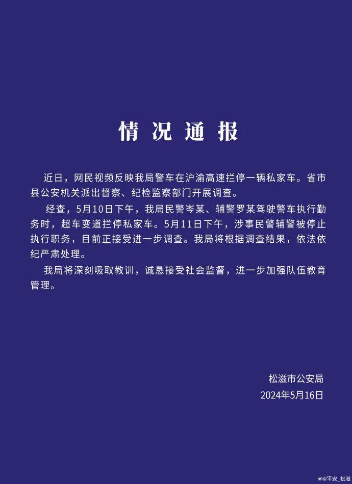 近日有网友发布视频显示在高速公路上一辆警车拦停一私家车5月16日深夜湖北松滋市公安局官方微博@平安_松滋发布《情况通报》涉事民警辅警被停职全文如下:近日,网民视频反映我局警车在沪渝高速拦停一辆私家车。