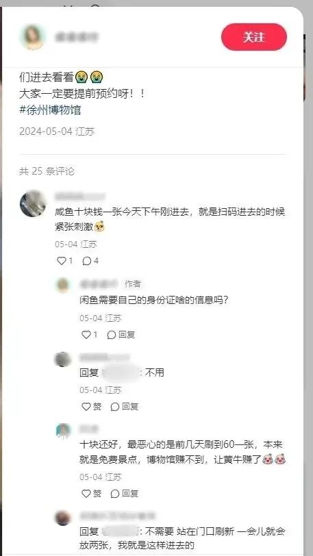 近年来,“博物馆旅游”受到不少人青睐。很多博物馆都“一票难求”。近日,一些游客在徐报“天天3·15平台上”投诉,“明明预约已满,徐州博物馆外面还有人拉客,声称可以带人入内。”“在二手平台有‘徐州博物馆
