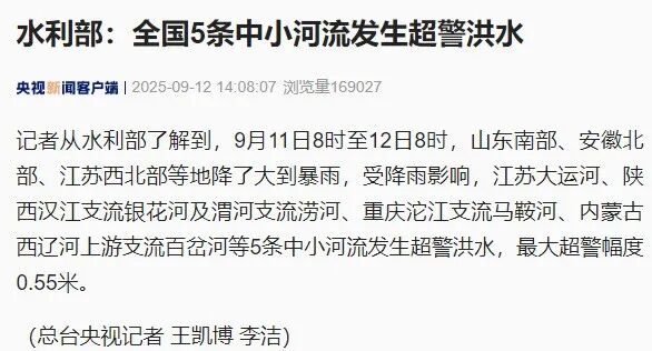 据央视新闻消息,记者从水利部了解到,9月11日8时至12日8时,山东南部、安徽北部、江苏西北部等地降了大到暴雨,受降雨影响,江苏大运河、陕西汉江支流银花河及渭河支流涝河、重庆沱江支流马鞍河、内蒙古西辽