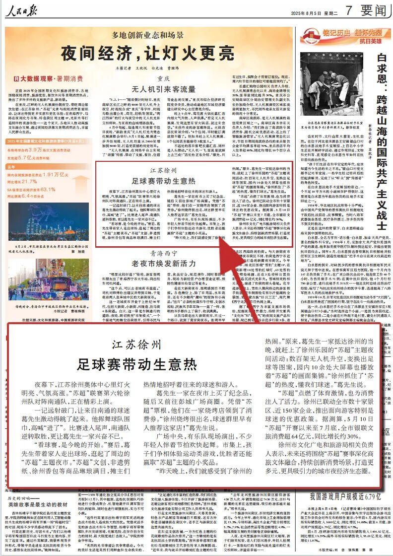 《人民日报》聚焦徐州如何把“苏超”元素与夜间消费紧密联动让球迷得到更多实惠和更优体验↓↓↓具体来看江苏徐州足球赛带动生意热夜幕下,江苏徐州奥体中心里灯火明亮、气氛高涨。“苏超”联赛第六轮徐州队对阵南通