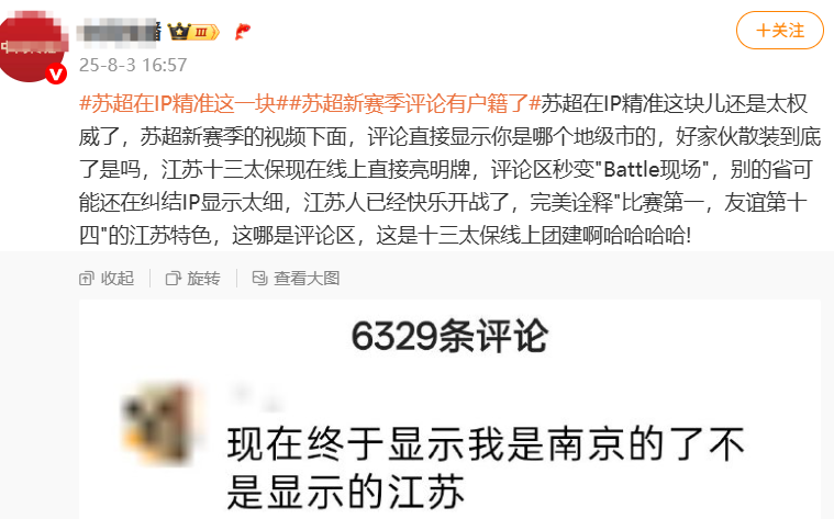 近日,有网友发现在快手平台“苏超”相关视频的评论区,可以精准显示评论人员所在的地级市,而非以前的省。对此,据媒体观察,这是平台官方上线的新功能,现在苏超优质视频评论区的IP可以精准到地级市。这下可精准