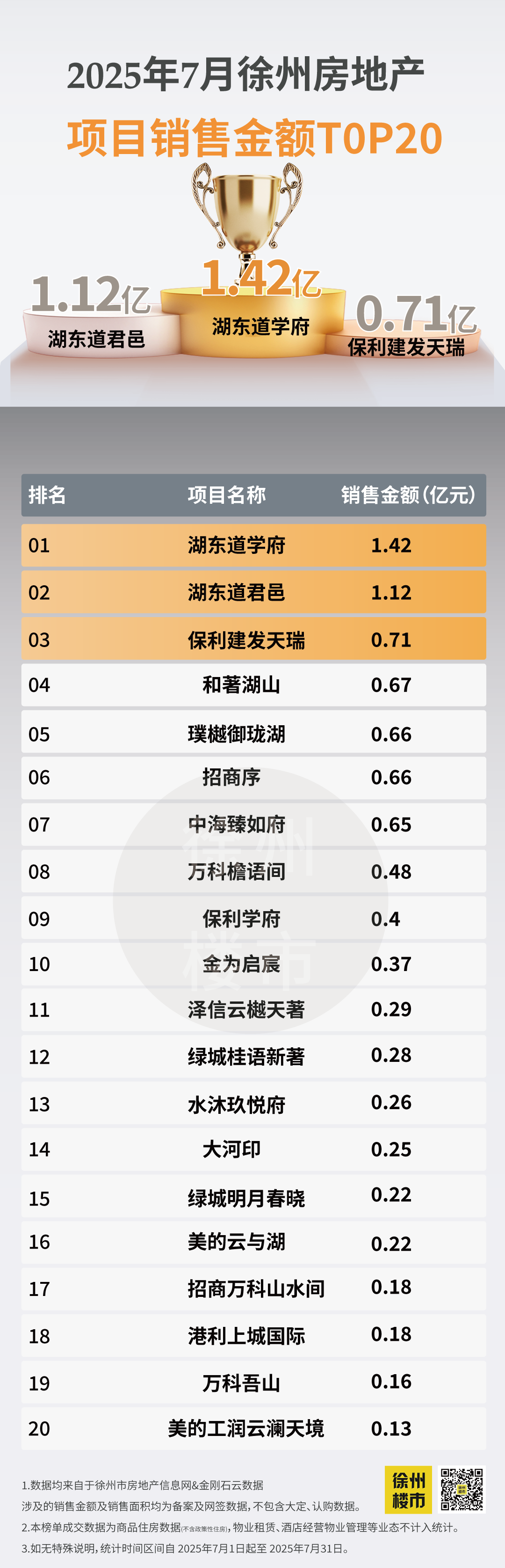 低密度、高品质楼盘,继续领跑徐州!刚刚,今年徐州7月楼市最新数据曝光,改善型楼盘亮眼。今年三四季度,低密度、高品质楼盘,要掐起来了!1、7月份徐州销售金额排行榜单出炉(金刚石数据),新城区大龙湖畔湖东