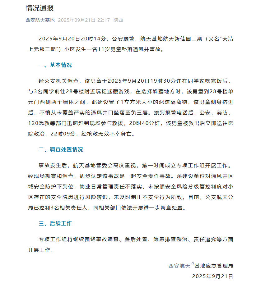 脚下“雷区”有多危险?近日就有这样一起悲剧为大家敲响警钟据陕西西安航天基地应急管理局通报2025年9月20日晚一名11岁男童在小区内与同学玩捉迷藏时不慎从未覆盖严实的通风井口坠落至负三层辖区消防等救援