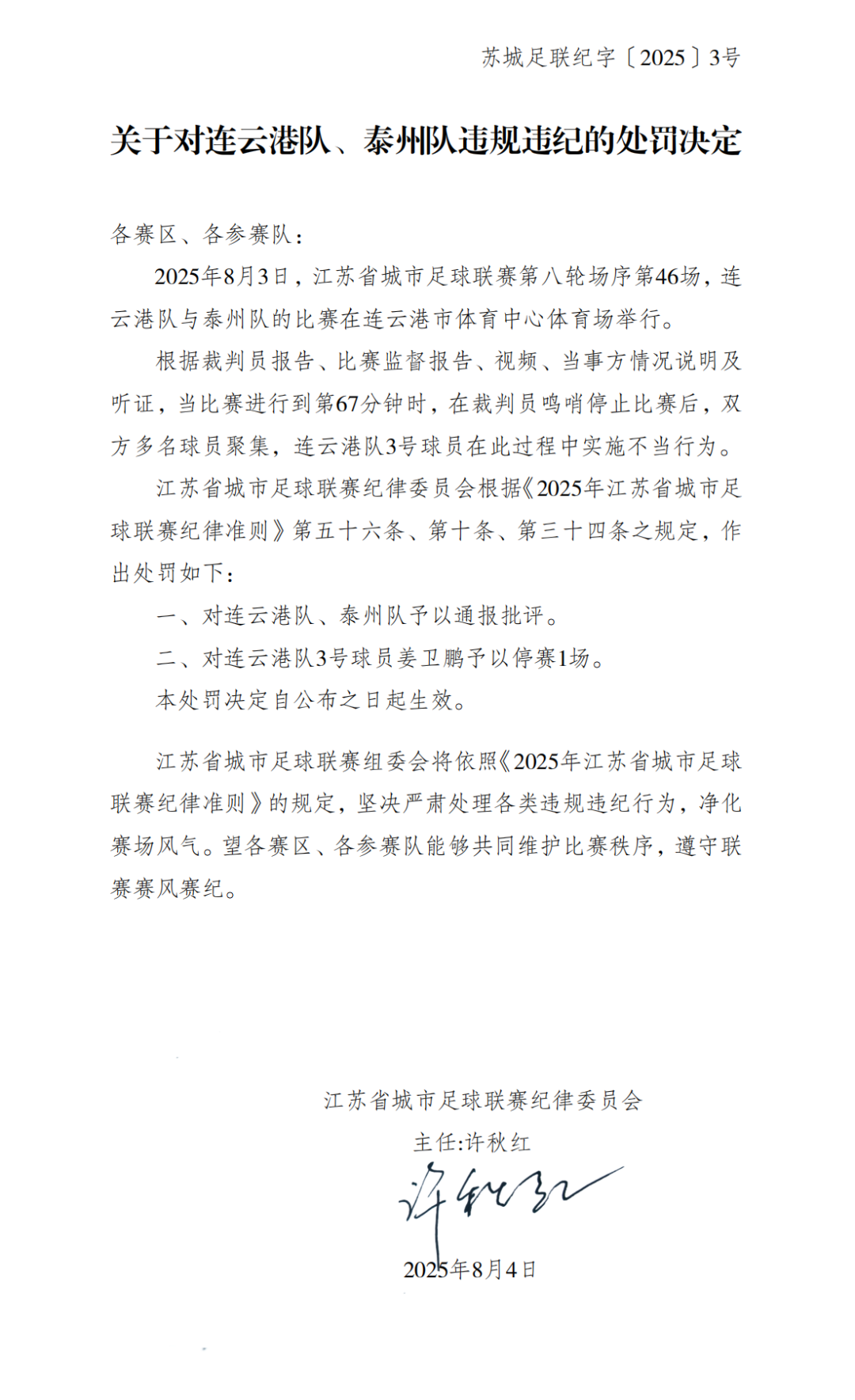 江苏省城市足球联赛发布关于对连云港队、泰州队违规违纪的处罚决定 ↓↓↓