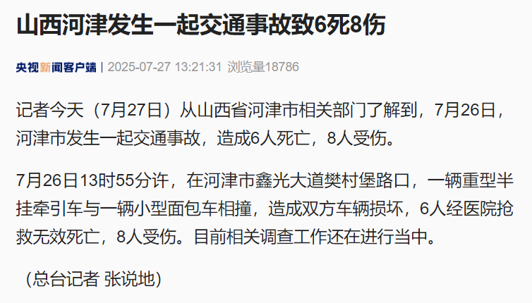 记者今天(7月27日)从山西省河津市相关部门了解到,7月26日,河津市发生一起交通事故,造成6人死亡,8人受伤。7月26日13时55分许,在河津市鑫光大道樊村堡路口,一辆重型半挂牵引车与一辆小型面包车