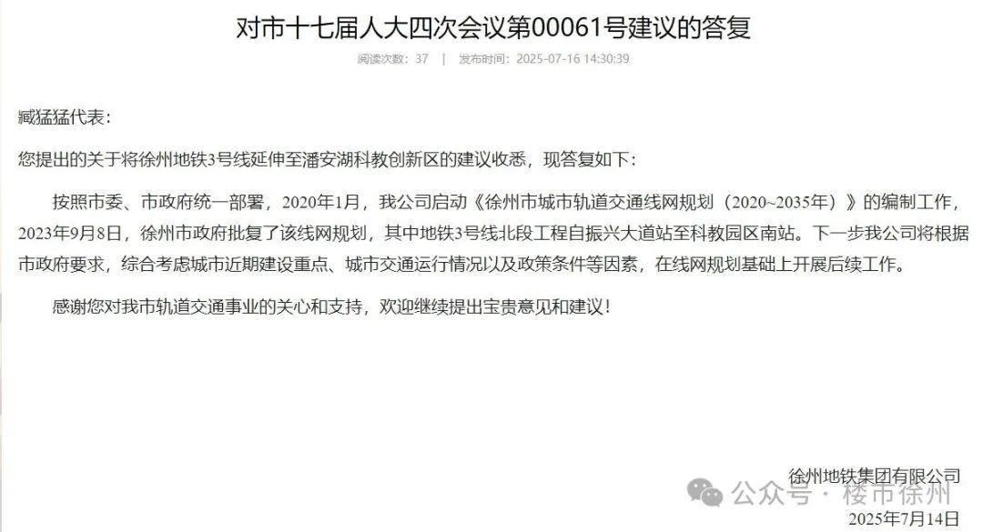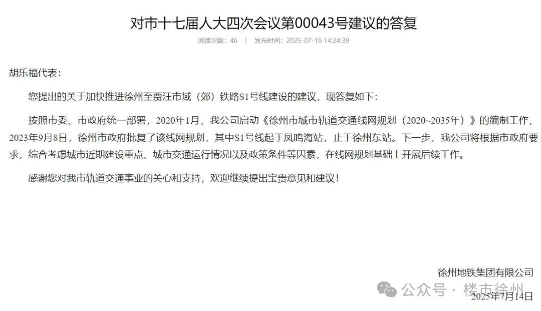 近日,代表关于轨道交通的两个建议,有官方答复了!① 代表建议加快S1号线建设对市十七届人大四次会议第00043号建议的答复胡乐福代表:您提出的关于加快推进徐州至贾汪市域(郊)铁路S1号线建设的建议,现