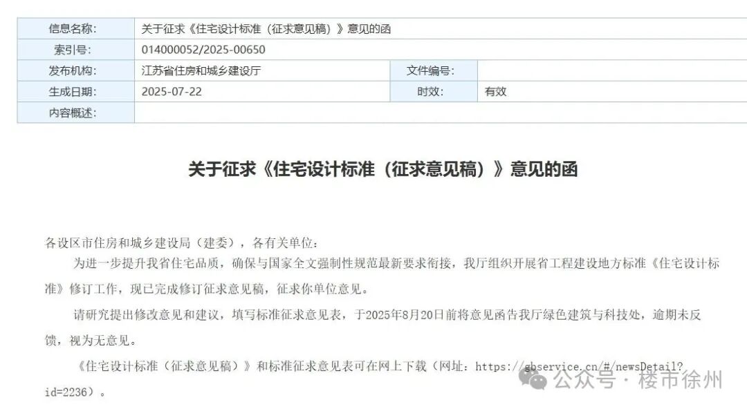 江苏省住房和城乡建设厅发布《关于征求《住宅设计标准(征求意见稿)》意见的函》。为保障居民基本住房条件和功能质量,提高城镇住宅设计和建造水平,制定本标准。这个标准与徐州的商品房住宅品质息息相关,关乎每位