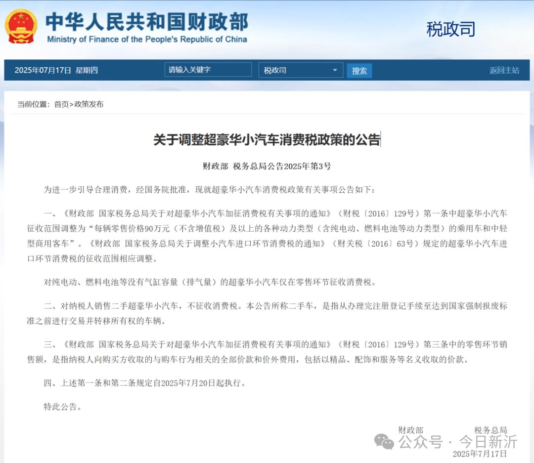 为进一步引导合理消费,经国务院批准,财政部、税务总局7月17日发布《关于调整超豪华小汽车消费税政策的公告》(下文简称“公告”)。公告称,《财政部 国家税务总局关于对超豪华小汽车加征消费税有关事项的通知