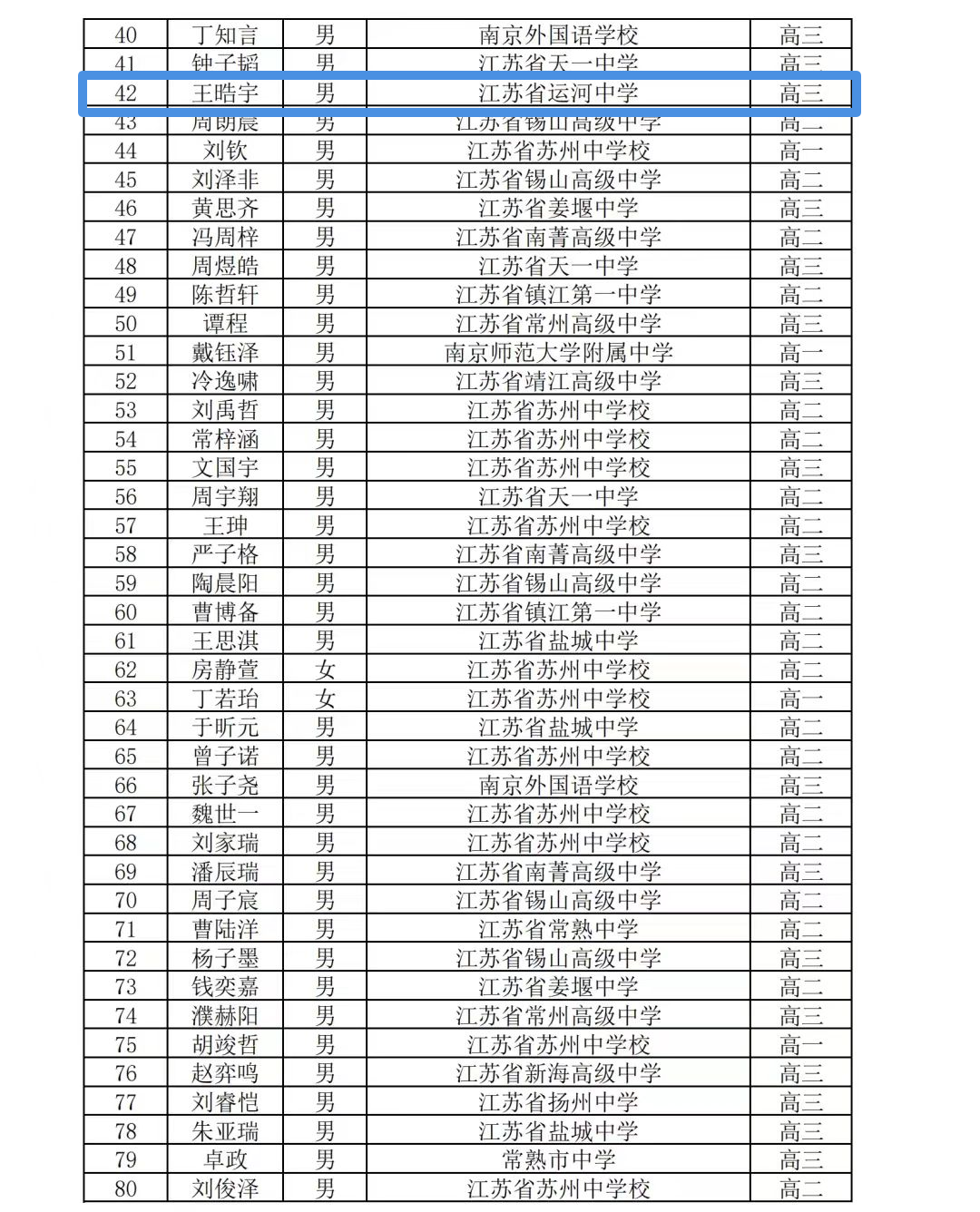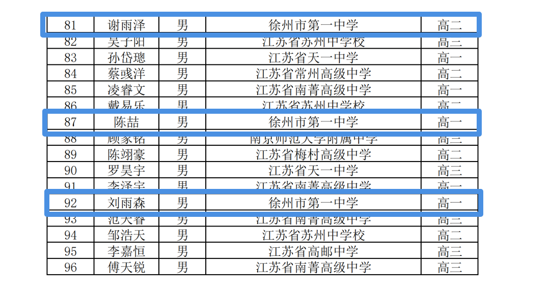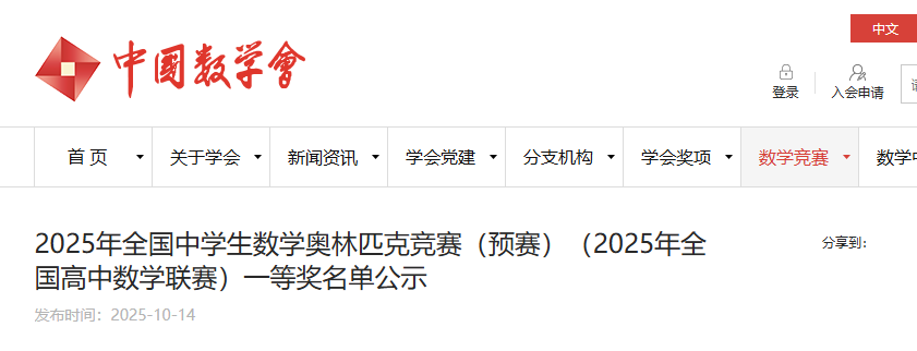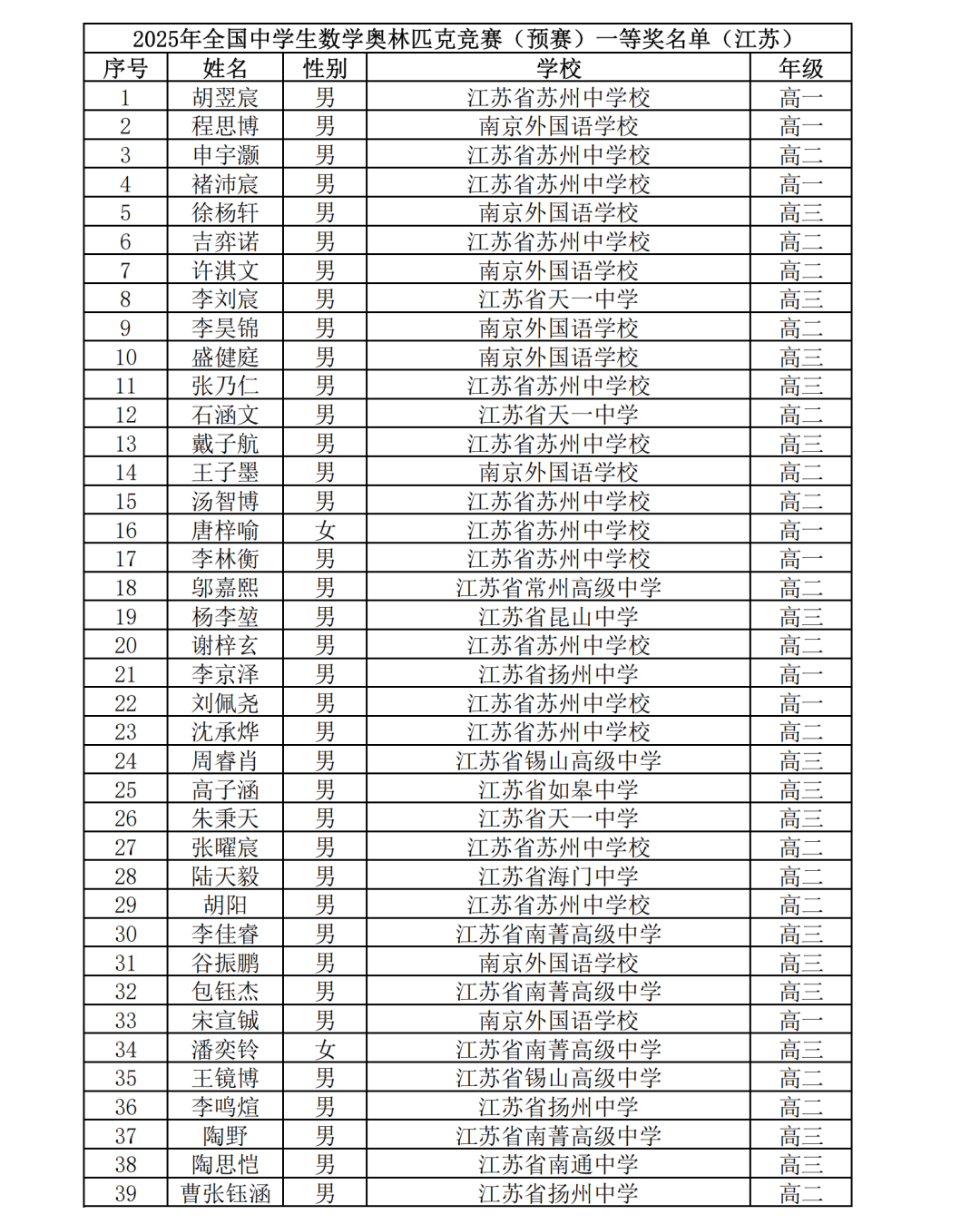 10月14日中国数学会官网发布2025年全国中学生数学奥林匹克竞赛(预赛)(2025年全国高中数学联赛)一等奖名单公示徐州市第一中学、江苏省运河中学的多位同学荣获一等奖2025年全国中学生数学奥林匹克