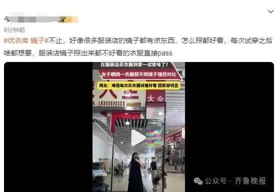 6月16日,#优衣库 镜子#话题登上微博热搜第一,部分网友怀疑优衣库线下门店试衣镜带有“滤镜”,称在店里试穿时照镜子觉得好看,但回家后差别较大。有网友表示,这可能跟店里灯光等环境因素有关。还有网友称,