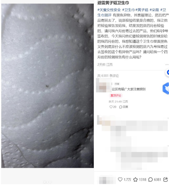 6月17日晚,@朵薇Domyway 发长文回应,称黑点系无纺布生产过程中部分突出纤维受热碳化,可放心使用。全文如下:自朵薇品牌发布以来,已经销售超过1亿片卫生巾,非常感谢大家的喜爱与认可。当然,在这一