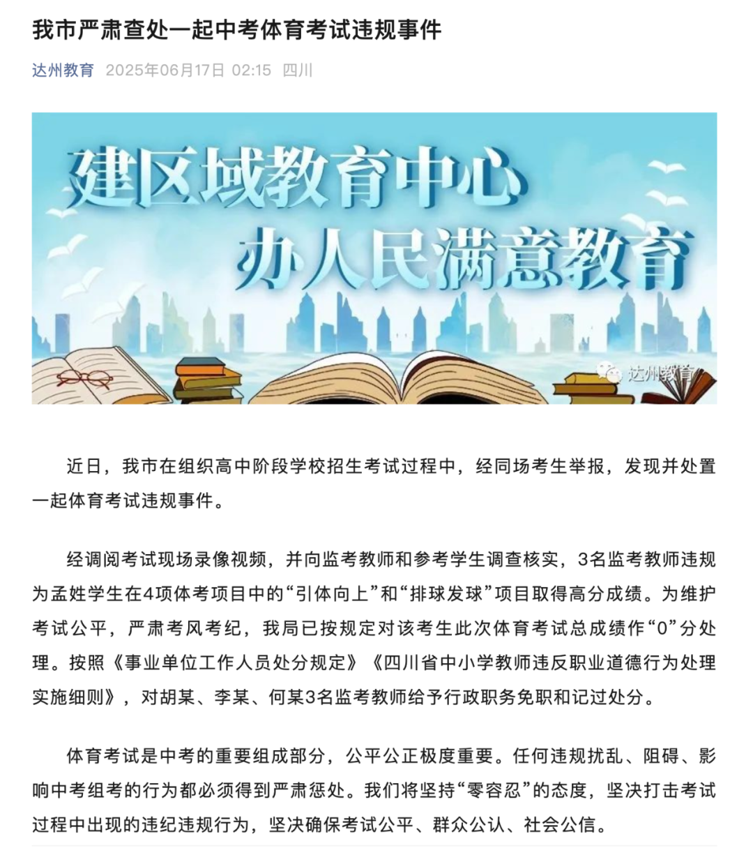 近日,有多名自称四川省达州市中考生的网友反映,在今年5月的体育考试中,有考生通过任学校教师的亲属修改考试成绩。6月17日凌晨,四川省达州市教育局发布通报:近日,我市在组织高中阶段学校招生考试过程中,经