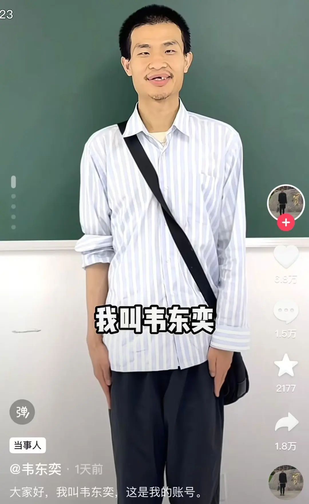 6月6日,有网友在短视频平台发现一用户名为“韦东奕”的账号,在简介中称系“韦东奕本人账号”,疑似是此前走红网络的北大“韦神”本人。截至6月6日14时11分,目前该账号仅有1条4秒的出镜视频,粉丝数量达